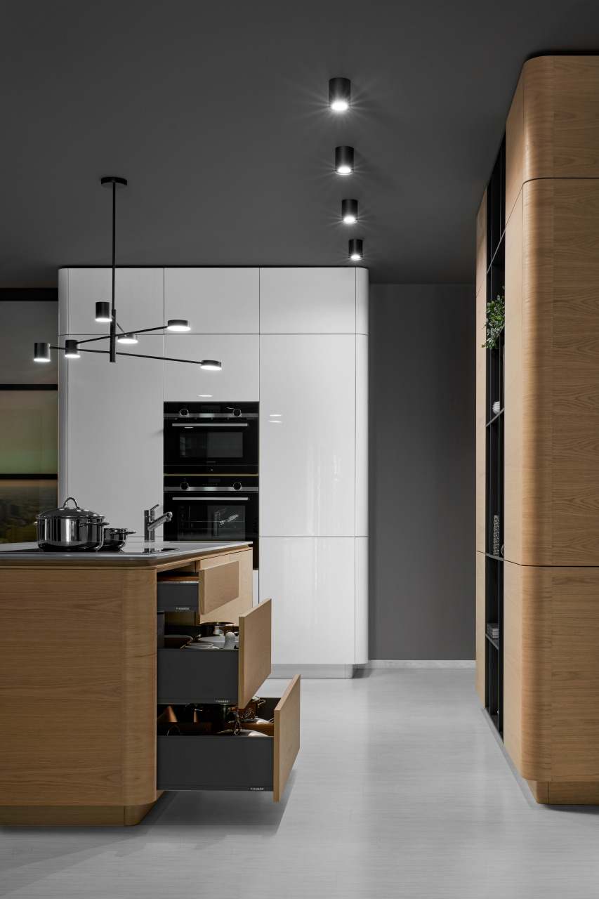 se zaoblenými prvky, jako středobod celé kuchyně. Koncové boky s rádiusem 80 vyrábíme v laku i v dýze.