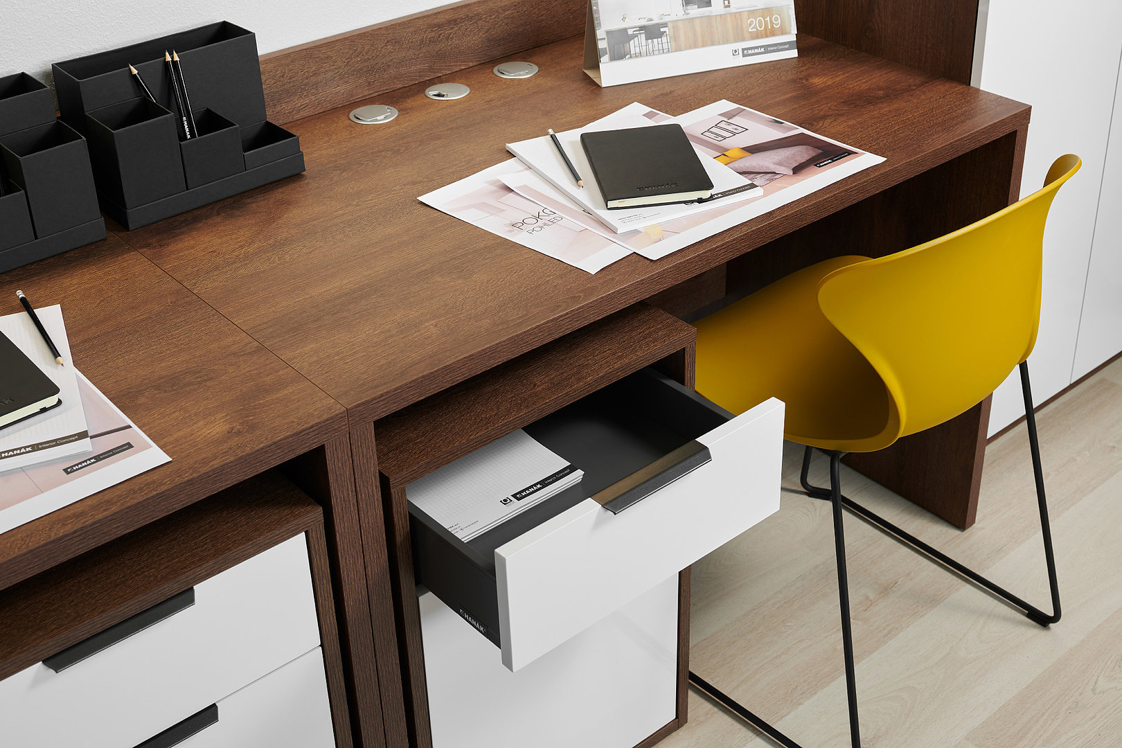 s vývody pro kabeláž a nechybí ani praktický kontejner se zásuvkami.