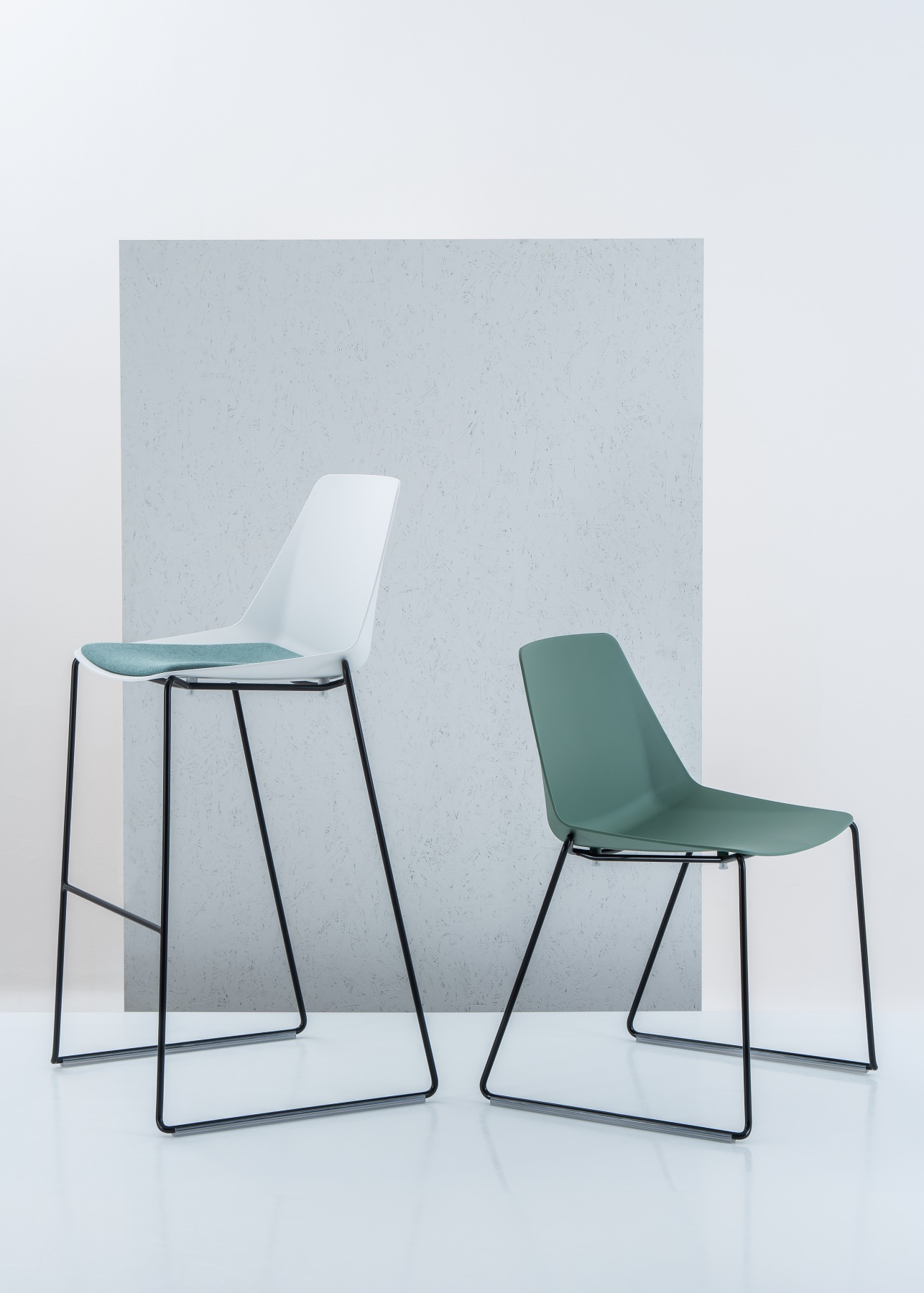 Kolekce TOP nabízí klasickou kuchyňskou židli i vyšší barovou verzi. Obě varianty jsou dostupné s klasickou nebo ližinovou kovovou podnoží a všechny verze je možné doplnit barevným polypropylenovým nebo čalouněným sedákem.